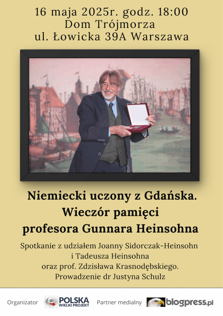 | Szanowni Państwo, serdecznie zapraszamy na wyjątkowe spotkanie: Niemiecki uczony z Gdańska. Wieczór pamięci profesora Gunnara Heinsohna z udziałem Joanny Sidorczak-Heinsohn i Tadeusza Heinsohna oraz prof. Zdzisława Krasnodębskiego. Prowadzenie dr Justyna Schulz.Wieczór wspomnień i rozmów odbędzie się w Domu Trójmorza przy ul. Łowickiej 39A w Warszawie w dniu 16 maja 2025 r. o godzinie 18:00. Wstęp wolny Prof. dr Gunnar Heinsohn znakomity socjolog, ekonomista, demograf, historyk i kolekcjoner urodził w 1943 r. w Gdyni, wówczas nazwanej przez okupantów Gotenhafen. Nigdy nie poznał swojego ojca, który zginął jako dowódca U-Boota, zanim on przyszedł na świat. Wykładał na uniwersytecie w Bremie od 1973 do 2009 r. Przed kilkunastu laty Gunnar Heinsohn wrócił na stałe do swych stron rodzinnych i został niemieckim gdańszczaninem w polskim Gdańsku, chroniąc się przed szykanami w Niemczech i na bremeńskim uniwersytecie. Kontynuując międzynarodową karierę wnosił swój wkład do polskiego życia intelektualnego. Był Niemcem, dla którego pojednanie z Polską nie było dobrze brzmiącą polityczną deklaracją, lecz codzienną oczywistością. We wrześniu 2021 r. otrzymał na kongresie Polska Wielki Projekt medal „Odwaga i Wiarygodność” przyznawany cudzoziemcom lub Polakom mieszkającym stale za granicą, którzy w sposób odważny i wiarygodny przyczyniają się do znajomości Polski i polskiej kultury w świecie oraz dbają o jej dobre imię. Zachęcamy zapoznania się artykułami poświęconymi prof. Heinsohnowi w numerze czasopisma Karto-Teka Gdańska: https://czasopisma.bg.ug.edu.pl/index.php/karto-teka/issue/view/759 oraz wywiadu z prof. Heinsohnem w Polskie Radio 24: https://polskieradio24.pl/artykul/2810261,historia-prof-heinsohna-moj-ojciec-nalezal-do-zolnierzy-ktorzy-zaczeli-ii-wojne-swiatowa |