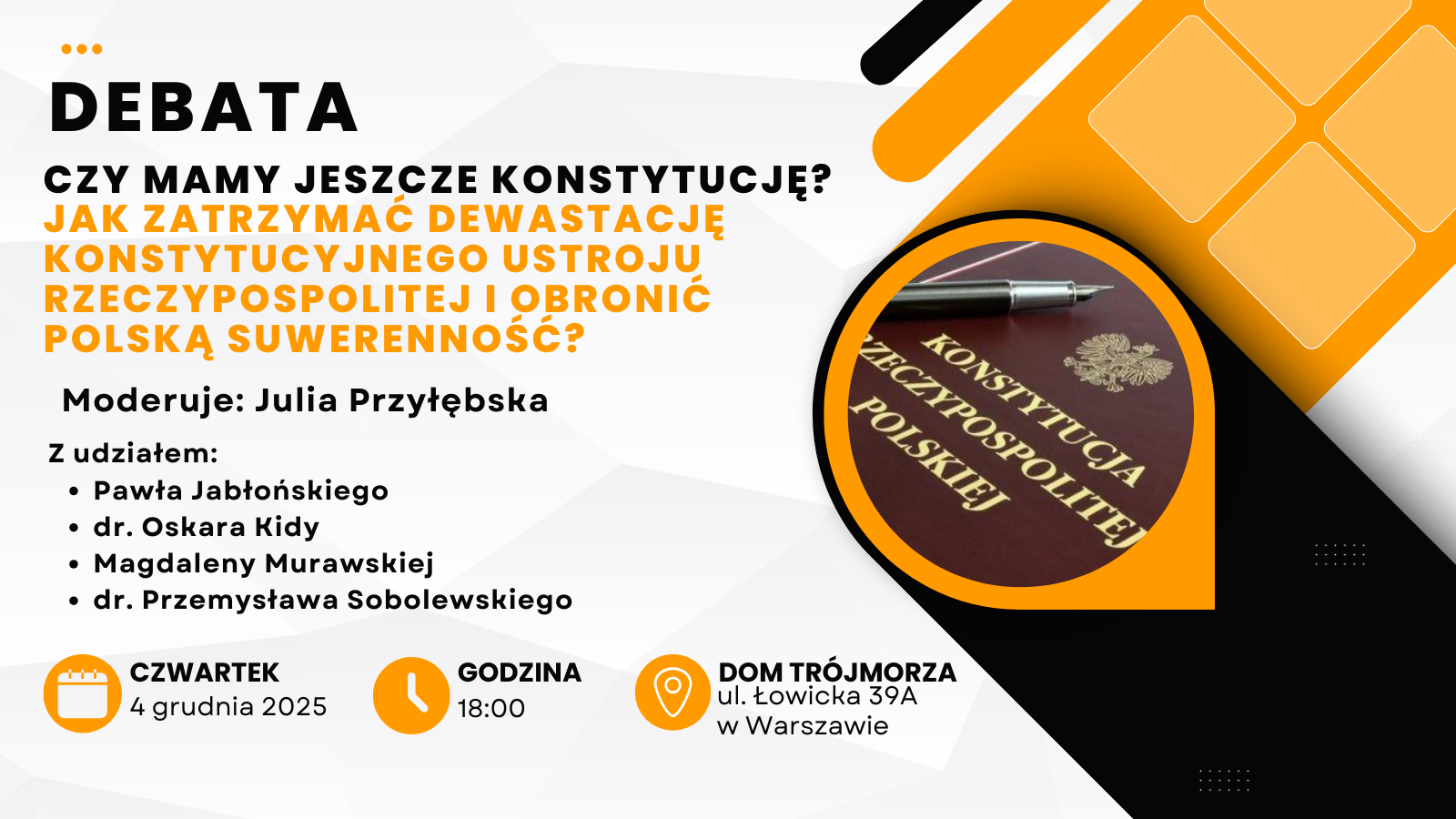 Zapraszamy na debatę: Czy mamy jeszcze Konstytucję? Julia Przyłębska, Paweł Jabłoński, Oskar Kida, Magdalena Murawska, Przemysław Sobolewski – 4 grudnia 2025 r. godz. 18:00.