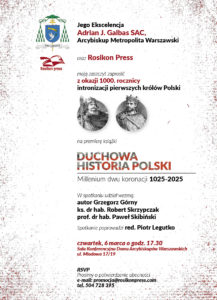 Zaproszenie na premierę książki “Duchowa historia Polski. Milenium dwu koronacji 1025-2025” autorstwa Grzegorza Górnego, 6 marca 2025 r. godz. 17:30, DAW ul. Miodowa 17/19